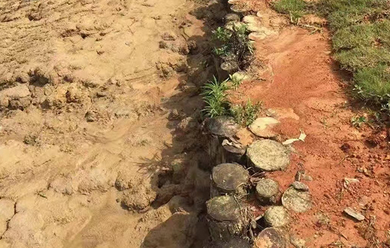 改造魚(yú)塘,堤壩用木樁加固為了穩(wěn)定壩的基礎(chǔ),兩邊用松木樁固定;相對(duì)來(lái)說(shuō)木樁成本較低。